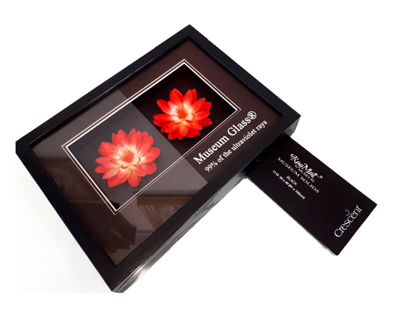 Vidrio de museo: Protección UV 99% y 70 %. Cartulina 100% de algodón libre de ácido. Vidrio antirreflejante. Foamboard. Adhesivos libres de ácido.